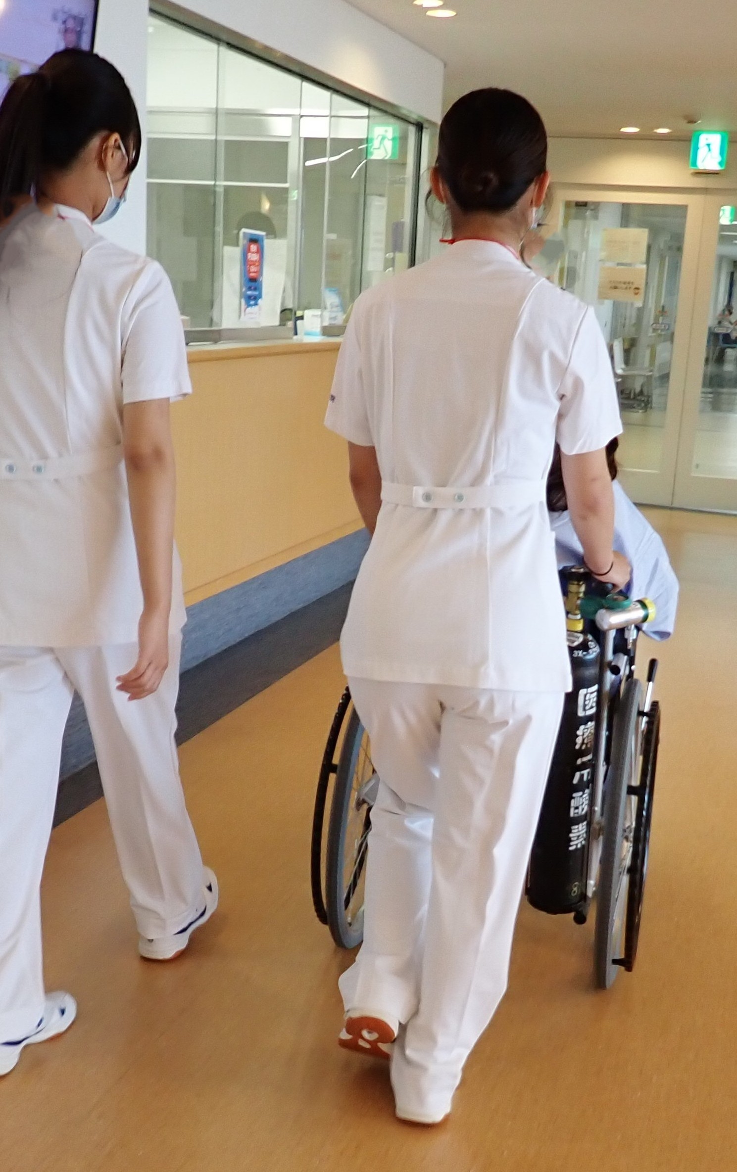 各病棟で看護師に同行して患者さんのベッドサイドに行き、看護師と一緒に洗髪や足浴などの清潔ケアや車いす搬送を行ったり、患者さんとコミュニケーションをとったり、高校生同士で血圧測定するなどの体験をしました。