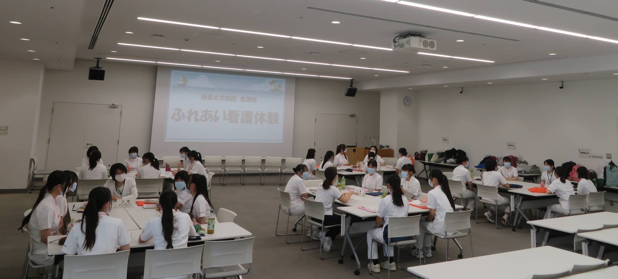 制服姿で訪れた高校生たちがユニフォームに着替え、オリエンテーション、記念写真撮影を行い、緊張した表情も見られましたが、看護師のような雰囲気になってきました。