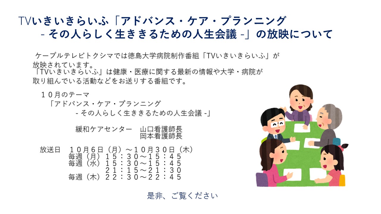 ケーブルテレビトクシマで放映されている徳島大学病院制作番組「TVいきいきらいふ」では、健康・医療に関する最新の情報や大学病院が取り組んでいる活動などをお送りしています。