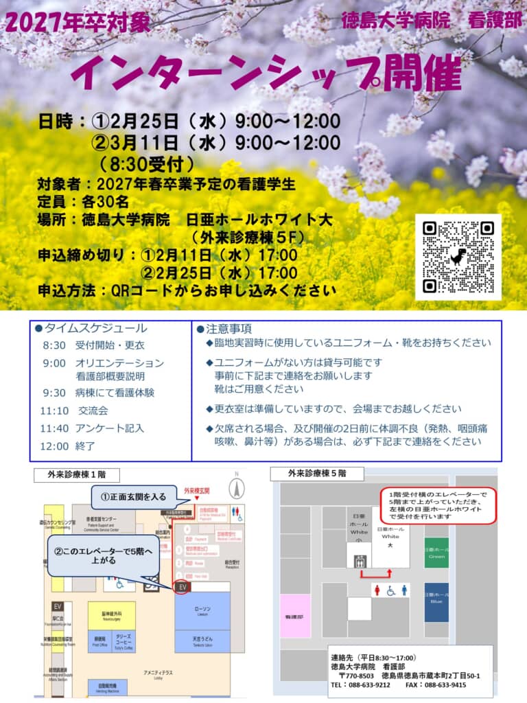 2026年2月と3月に、2027年春卒の看護学生対象のインターンシップを開催します。
